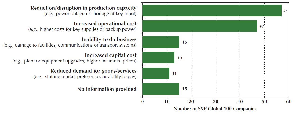 Climate change will impact businesses in many ways. The impacts of climate change, such as increased temperatures, heavy wind and rainfall events, sea level rise, and flooding may result in business interruptions due to road closures, damage to facilities or power outages, reduction of products due to shipping delays, and increased insurance costs due to infrastructure damages (Figure 1).